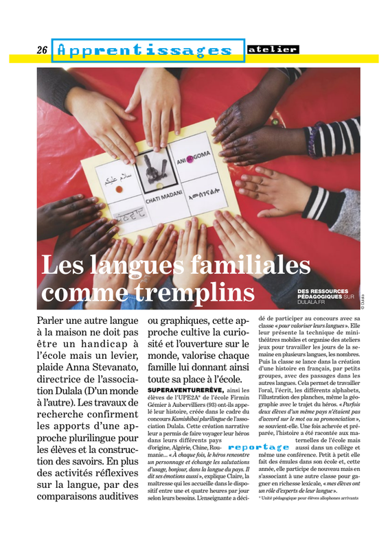 Passer vers le contenu Accueil Présentation du projet Accueillir l’élève et sa famille Cadre réglementaire Ressources pour l’accueil des familles Ressources pour communiquer avec les familles Faire classe L’éveil aux langues Faire classe: Activités Albums pour la classe Approfondir et se former Ouvrages, articles, travaux de recherche Ressources pour se former Formations en ligne Actualités BILEM: nouvelle fiche d’activité (10/07/19) Ofelia Garcia: « le bilinguisme est plus que l’addition de deux langues » Pour ses 10 ans, Dulala fait “Place aux langues” Congrès EDiLiC (Éducation et Diversité Linguistique et Culturelle) lancement d’un nouveau DU de l’université de Lille Journée d’étude: le bilinguisme turc-français Techniques d’artistes pour livres d’enfants Le Concours Kamishibaï plurilingue colloque du CELV: Formation des enseignants DULALA: Université d’été 2018 Aucun bilinguisme n’est supérieur à un autre Accueillir l'élève et sa famille Des ressources pour organiser la médiation école-famille, des recueils de pratiques pédagogiques, des guides et documents administratifs plurilingues, etc. Consulter Faire classe Des activités à conduire en classe, des ressources pédagogiques pour faire entrer l'éveil aux langues dans vos pratiques professionnelles, des témoignages de professeurs... Consulter Approfondir et se former Pour se former au français langue de scolarisation, des parcours de formation en ligne, des ressources universitaires, des articles, des références blbliographiques Consulter Accueillir l'élève et sa famille Faire classe Approfondir et se former Nous contacter Mentions légales Les ressources présentées sur ce site sont le résultat d'un projet de recherche-action-formation qui a associé l'Université de Franche-Comté, l'ESPE de Besançon et le CASNAV de l'Académie de Besancon. Présentation et historique du projet Fonctionne avec Nirvana & WordPress.